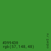 Цвет #399430 в цветовой модели RGB обозначается тремя октетами (57, 148, 48) в десятичном формате и #399430 в шестнадцатиричном (hex) формате, которые являются интенсивностью красного 57 (hex 39), интенсивность зелёного 148 (hex 94) и интенсивность синего 48 (hex 30).