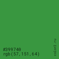 Цвет #399740 в цветовой модели RGB обозначается тремя октетами (57, 151, 64) в десятичном формате и #399740 в шестнадцатиричном (hex) формате, которые являются интенсивностью красного 57 (hex 39), интенсивность зелёного 151 (hex 97) и интенсивность синего 64 (hex 40).