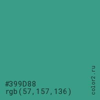 Цвет #399D88 в цветовой модели RGB обозначается тремя октетами (57, 157, 136) в десятичном формате и #399D88 в шестнадцатиричном (hex) формате, которые являются интенсивностью красного 57 (hex 39), интенсивность зелёного 157 (hex 9D) и интенсивность синего 136 (hex 88).