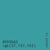 Цвет #399DA2 в цветовой модели RGB обозначается тремя октетами (57, 157, 162) в десятичном формате и #399DA2 в шестнадцатиричном (hex) формате, которые являются интенсивностью красного 57 (hex 39), интенсивность зелёного 157 (hex 9D) и интенсивность синего 162 (hex A2).
