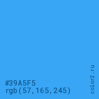Цвет #39A5F5 в цветовой модели RGB обозначается тремя октетами (57, 165, 245) в десятичном формате и #39A5F5 в шестнадцатиричном (hex) формате, которые являются интенсивностью красного 57 (hex 39), интенсивность зелёного 165 (hex A5) и интенсивность синего 245 (hex F5).