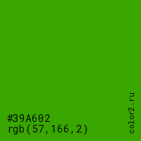Цвет #39A602 в цветовой модели RGB обозначается тремя октетами (57, 166, 2) в десятичном формате и #39A602 в шестнадцатиричном (hex) формате, которые являются интенсивностью красного 57 (hex 39), интенсивность зелёного 166 (hex A6) и интенсивность синего 2 (hex 02).