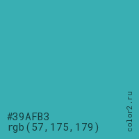 Цвет #39AFB3 в цветовой модели RGB обозначается тремя октетами (57, 175, 179) в десятичном формате и #39AFB3 в шестнадцатиричном (hex) формате, которые являются интенсивностью красного 57 (hex 39), интенсивность зелёного 175 (hex AF) и интенсивность синего 179 (hex B3).