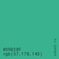 Цвет #39B28F в цветовой модели RGB обозначается тремя октетами (57, 178, 143) в десятичном формате и #39B28F в шестнадцатиричном (hex) формате, которые являются интенсивностью красного 57 (hex 39), интенсивность зелёного 178 (hex B2) и интенсивность синего 143 (hex 8F).