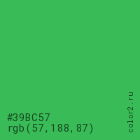 Цвет #39BC57 в цветовой модели RGB обозначается тремя октетами (57, 188, 87) в десятичном формате и #39BC57 в шестнадцатиричном (hex) формате, которые являются интенсивностью красного 57 (hex 39), интенсивность зелёного 188 (hex BC) и интенсивность синего 87 (hex 57).