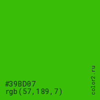 Цвет #39BD07 в цветовой модели RGB обозначается тремя октетами (57, 189, 7) в десятичном формате и #39BD07 в шестнадцатиричном (hex) формате, которые являются интенсивностью красного 57 (hex 39), интенсивность зелёного 189 (hex BD) и интенсивность синего 7 (hex 07).