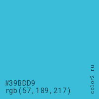 Цвет #39BDD9 в цветовой модели RGB обозначается тремя октетами (57, 189, 217) в десятичном формате и #39BDD9 в шестнадцатиричном (hex) формате, которые являются интенсивностью красного 57 (hex 39), интенсивность зелёного 189 (hex BD) и интенсивность синего 217 (hex D9).