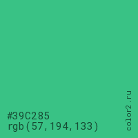 Цвет #39C285 в цветовой модели RGB обозначается тремя октетами (57, 194, 133) в десятичном формате и #39C285 в шестнадцатиричном (hex) формате, которые являются интенсивностью красного 57 (hex 39), интенсивность зелёного 194 (hex C2) и интенсивность синего 133 (hex 85).