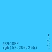 Цвет #39C8FF в цветовой модели RGB обозначается тремя октетами (57, 200, 255) в десятичном формате и #39C8FF в шестнадцатиричном (hex) формате, которые являются интенсивностью красного 57 (hex 39), интенсивность зелёного 200 (hex C8) и интенсивность синего 255 (hex FF).