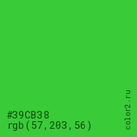 Цвет #39CB38 в цветовой модели RGB обозначается тремя октетами (57, 203, 56) в десятичном формате и #39CB38 в шестнадцатиричном (hex) формате, которые являются интенсивностью красного 57 (hex 39), интенсивность зелёного 203 (hex CB) и интенсивность синего 56 (hex 38).