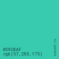 Цвет #39CBAF в цветовой модели RGB обозначается тремя октетами (57, 203, 175) в десятичном формате и #39CBAF в шестнадцатиричном (hex) формате, которые являются интенсивностью красного 57 (hex 39), интенсивность зелёного 203 (hex CB) и интенсивность синего 175 (hex AF).