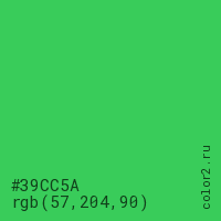 Цвет #39CC5A в цветовой модели RGB обозначается тремя октетами (57, 204, 90) в десятичном формате и #39CC5A в шестнадцатиричном (hex) формате, которые являются интенсивностью красного 57 (hex 39), интенсивность зелёного 204 (hex CC) и интенсивность синего 90 (hex 5A).