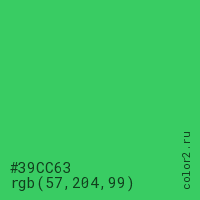 Цвет #39CC63 в цветовой модели RGB обозначается тремя октетами (57, 204, 99) в десятичном формате и #39CC63 в шестнадцатиричном (hex) формате, которые являются интенсивностью красного 57 (hex 39), интенсивность зелёного 204 (hex CC) и интенсивность синего 99 (hex 63).
