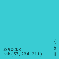 Цвет #39CCD3 в цветовой модели RGB обозначается тремя октетами (57, 204, 211) в десятичном формате и #39CCD3 в шестнадцатиричном (hex) формате, которые являются интенсивностью красного 57 (hex 39), интенсивность зелёного 204 (hex CC) и интенсивность синего 211 (hex D3).