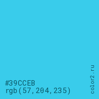 Цвет #39CCEB в цветовой модели RGB обозначается тремя октетами (57, 204, 235) в десятичном формате и #39CCEB в шестнадцатиричном (hex) формате, которые являются интенсивностью красного 57 (hex 39), интенсивность зелёного 204 (hex CC) и интенсивность синего 235 (hex EB).