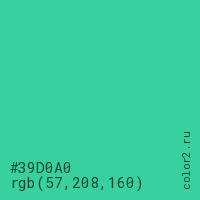 Цвет #39D0A0 в цветовой модели RGB обозначается тремя октетами (57, 208, 160) в десятичном формате и #39D0A0 в шестнадцатиричном (hex) формате, которые являются интенсивностью красного 57 (hex 39), интенсивность зелёного 208 (hex D0) и интенсивность синего 160 (hex A0).