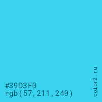 Цвет #39D3F0 в цветовой модели RGB обозначается тремя октетами (57, 211, 240) в десятичном формате и #39D3F0 в шестнадцатиричном (hex) формате, которые являются интенсивностью красного 57 (hex 39), интенсивность зелёного 211 (hex D3) и интенсивность синего 240 (hex F0).