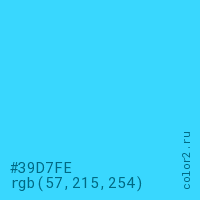 Цвет #39D7FE в цветовой модели RGB обозначается тремя октетами (57, 215, 254) в десятичном формате и #39D7FE в шестнадцатиричном (hex) формате, которые являются интенсивностью красного 57 (hex 39), интенсивность зелёного 215 (hex D7) и интенсивность синего 254 (hex FE).