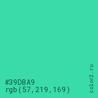 Цвет #39DBA9 в цветовой модели RGB обозначается тремя октетами (57, 219, 169) в десятичном формате и #39DBA9 в шестнадцатиричном (hex) формате, которые являются интенсивностью красного 57 (hex 39), интенсивность зелёного 219 (hex DB) и интенсивность синего 169 (hex A9).