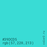 Цвет #39DCD5 в цветовой модели RGB обозначается тремя октетами (57, 220, 213) в десятичном формате и #39DCD5 в шестнадцатиричном (hex) формате, которые являются интенсивностью красного 57 (hex 39), интенсивность зелёного 220 (hex DC) и интенсивность синего 213 (hex D5).