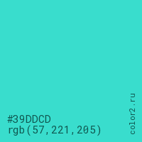 Цвет #39DDCD в цветовой модели RGB обозначается тремя октетами (57, 221, 205) в десятичном формате и #39DDCD в шестнадцатиричном (hex) формате, которые являются интенсивностью красного 57 (hex 39), интенсивность зелёного 221 (hex DD) и интенсивность синего 205 (hex CD).