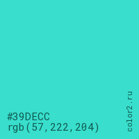 Цвет #39DECC в цветовой модели RGB обозначается тремя октетами (57, 222, 204) в десятичном формате и #39DECC в шестнадцатиричном (hex) формате, которые являются интенсивностью красного 57 (hex 39), интенсивность зелёного 222 (hex DE) и интенсивность синего 204 (hex CC).