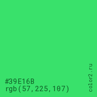 Цвет #39E16B в цветовой модели RGB обозначается тремя октетами (57, 225, 107) в десятичном формате и #39E16B в шестнадцатиричном (hex) формате, которые являются интенсивностью красного 57 (hex 39), интенсивность зелёного 225 (hex E1) и интенсивность синего 107 (hex 6B).