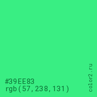 Цвет #39EE83 в цветовой модели RGB обозначается тремя октетами (57, 238, 131) в десятичном формате и #39EE83 в шестнадцатиричном (hex) формате, которые являются интенсивностью красного 57 (hex 39), интенсивность зелёного 238 (hex EE) и интенсивность синего 131 (hex 83).