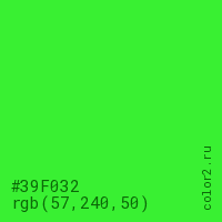 Цвет #39F032 в цветовой модели RGB обозначается тремя октетами (57, 240, 50) в десятичном формате и #39F032 в шестнадцатиричном (hex) формате, которые являются интенсивностью красного 57 (hex 39), интенсивность зелёного 240 (hex F0) и интенсивность синего 50 (hex 32).