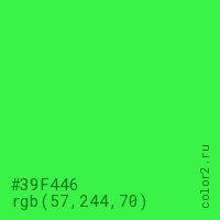 Цвет #39F446 в цветовой модели RGB обозначается тремя октетами (57, 244, 70) в десятичном формате и #39F446 в шестнадцатиричном (hex) формате, которые являются интенсивностью красного 57 (hex 39), интенсивность зелёного 244 (hex F4) и интенсивность синего 70 (hex 46).