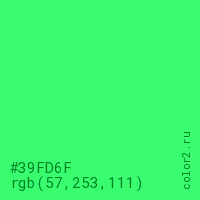 Цвет #39FD6F в цветовой модели RGB обозначается тремя октетами (57, 253, 111) в десятичном формате и #39FD6F в шестнадцатиричном (hex) формате, которые являются интенсивностью красного 57 (hex 39), интенсивность зелёного 253 (hex FD) и интенсивность синего 111 (hex 6F).