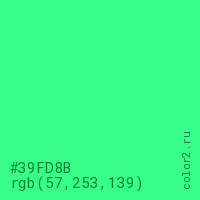 Цвет #39FD8B в цветовой модели RGB обозначается тремя октетами (57, 253, 139) в десятичном формате и #39FD8B в шестнадцатиричном (hex) формате, которые являются интенсивностью красного 57 (hex 39), интенсивность зелёного 253 (hex FD) и интенсивность синего 139 (hex 8B).
