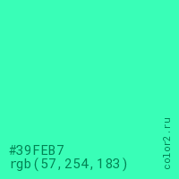 Цвет #39FEB7 в цветовой модели RGB обозначается тремя октетами (57, 254, 183) в десятичном формате и #39FEB7 в шестнадцатиричном (hex) формате, которые являются интенсивностью красного 57 (hex 39), интенсивность зелёного 254 (hex FE) и интенсивность синего 183 (hex B7).