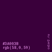 Цвет #3A003B в цветовой модели RGB обозначается тремя октетами (58, 0, 59) в десятичном формате и #3A003B в шестнадцатиричном (hex) формате, которые являются интенсивностью красного 58 (hex 3A), интенсивность зелёного 0 (hex 00) и интенсивность синего 59 (hex 3B).