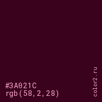 Цвет #3A021C в цветовой модели RGB обозначается тремя октетами (58, 2, 28) в десятичном формате и #3A021C в шестнадцатиричном (hex) формате, которые являются интенсивностью красного 58 (hex 3A), интенсивность зелёного 2 (hex 02) и интенсивность синего 28 (hex 1C).