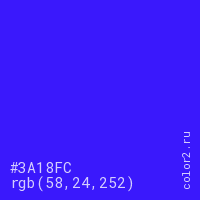 Цвет #3A18FC в цветовой модели RGB обозначается тремя октетами (58, 24, 252) в десятичном формате и #3A18FC в шестнадцатиричном (hex) формате, которые являются интенсивностью красного 58 (hex 3A), интенсивность зелёного 24 (hex 18) и интенсивность синего 252 (hex FC).