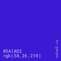 Цвет #3A1AD2 в цветовой модели RGB обозначается тремя октетами (58, 26, 210) в десятичном формате и #3A1AD2 в шестнадцатиричном (hex) формате, которые являются интенсивностью красного 58 (hex 3A), интенсивность зелёного 26 (hex 1A) и интенсивность синего 210 (hex D2).