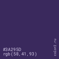 Цвет #3A295D в цветовой модели RGB обозначается тремя октетами (58, 41, 93) в десятичном формате и #3A295D в шестнадцатиричном (hex) формате, которые являются интенсивностью красного 58 (hex 3A), интенсивность зелёного 41 (hex 29) и интенсивность синего 93 (hex 5D).