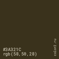 Цвет #3A321C в цветовой модели RGB обозначается тремя октетами (58, 50, 28) в десятичном формате и #3A321C в шестнадцатиричном (hex) формате, которые являются интенсивностью красного 58 (hex 3A), интенсивность зелёного 50 (hex 32) и интенсивность синего 28 (hex 1C).