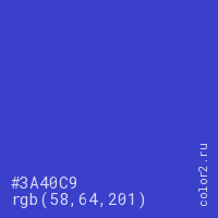 Цвет #3A40C9 в цветовой модели RGB обозначается тремя октетами (58, 64, 201) в десятичном формате и #3A40C9 в шестнадцатиричном (hex) формате, которые являются интенсивностью красного 58 (hex 3A), интенсивность зелёного 64 (hex 40) и интенсивность синего 201 (hex C9).
