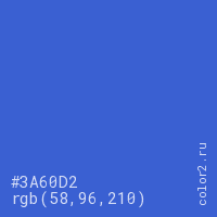 Цвет #3A60D2 в цветовой модели RGB обозначается тремя октетами (58, 96, 210) в десятичном формате и #3A60D2 в шестнадцатиричном (hex) формате, которые являются интенсивностью красного 58 (hex 3A), интенсивность зелёного 96 (hex 60) и интенсивность синего 210 (hex D2).
