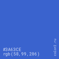 Цвет #3A63CE в цветовой модели RGB обозначается тремя октетами (58, 99, 206) в десятичном формате и #3A63CE в шестнадцатиричном (hex) формате, которые являются интенсивностью красного 58 (hex 3A), интенсивность зелёного 99 (hex 63) и интенсивность синего 206 (hex CE).