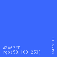 Цвет #3A67FD в цветовой модели RGB обозначается тремя октетами (58, 103, 253) в десятичном формате и #3A67FD в шестнадцатиричном (hex) формате, которые являются интенсивностью красного 58 (hex 3A), интенсивность зелёного 103 (hex 67) и интенсивность синего 253 (hex FD).