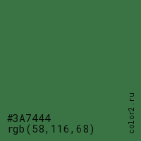 Цвет #3A7444 в цветовой модели RGB обозначается тремя октетами (58, 116, 68) в десятичном формате и #3A7444 в шестнадцатиричном (hex) формате, которые являются интенсивностью красного 58 (hex 3A), интенсивность зелёного 116 (hex 74) и интенсивность синего 68 (hex 44).