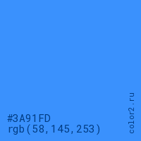 Цвет #3A91FD в цветовой модели RGB обозначается тремя октетами (58, 145, 253) в десятичном формате и #3A91FD в шестнадцатиричном (hex) формате, которые являются интенсивностью красного 58 (hex 3A), интенсивность зелёного 145 (hex 91) и интенсивность синего 253 (hex FD).