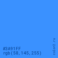 Цвет #3A91FF в цветовой модели RGB обозначается тремя октетами (58, 145, 255) в десятичном формате и #3A91FF в шестнадцатиричном (hex) формате, которые являются интенсивностью красного 58 (hex 3A), интенсивность зелёного 145 (hex 91) и интенсивность синего 255 (hex FF).