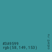 Цвет #3A9599 в цветовой модели RGB обозначается тремя октетами (58, 149, 153) в десятичном формате и #3A9599 в шестнадцатиричном (hex) формате, которые являются интенсивностью красного 58 (hex 3A), интенсивность зелёного 149 (hex 95) и интенсивность синего 153 (hex 99).