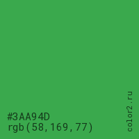 Цвет #3AA94D в цветовой модели RGB обозначается тремя октетами (58, 169, 77) в десятичном формате и #3AA94D в шестнадцатиричном (hex) формате, которые являются интенсивностью красного 58 (hex 3A), интенсивность зелёного 169 (hex A9) и интенсивность синего 77 (hex 4D).