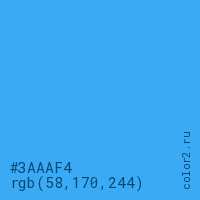 Цвет #3AAAF4 в цветовой модели RGB обозначается тремя октетами (58, 170, 244) в десятичном формате и #3AAAF4 в шестнадцатиричном (hex) формате, которые являются интенсивностью красного 58 (hex 3A), интенсивность зелёного 170 (hex AA) и интенсивность синего 244 (hex F4).