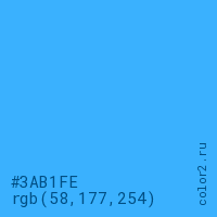 Цвет #3AB1FE в цветовой модели RGB обозначается тремя октетами (58, 177, 254) в десятичном формате и #3AB1FE в шестнадцатиричном (hex) формате, которые являются интенсивностью красного 58 (hex 3A), интенсивность зелёного 177 (hex B1) и интенсивность синего 254 (hex FE).